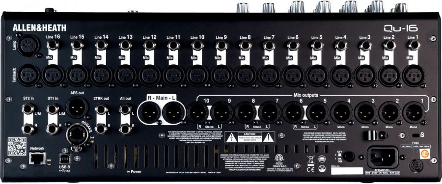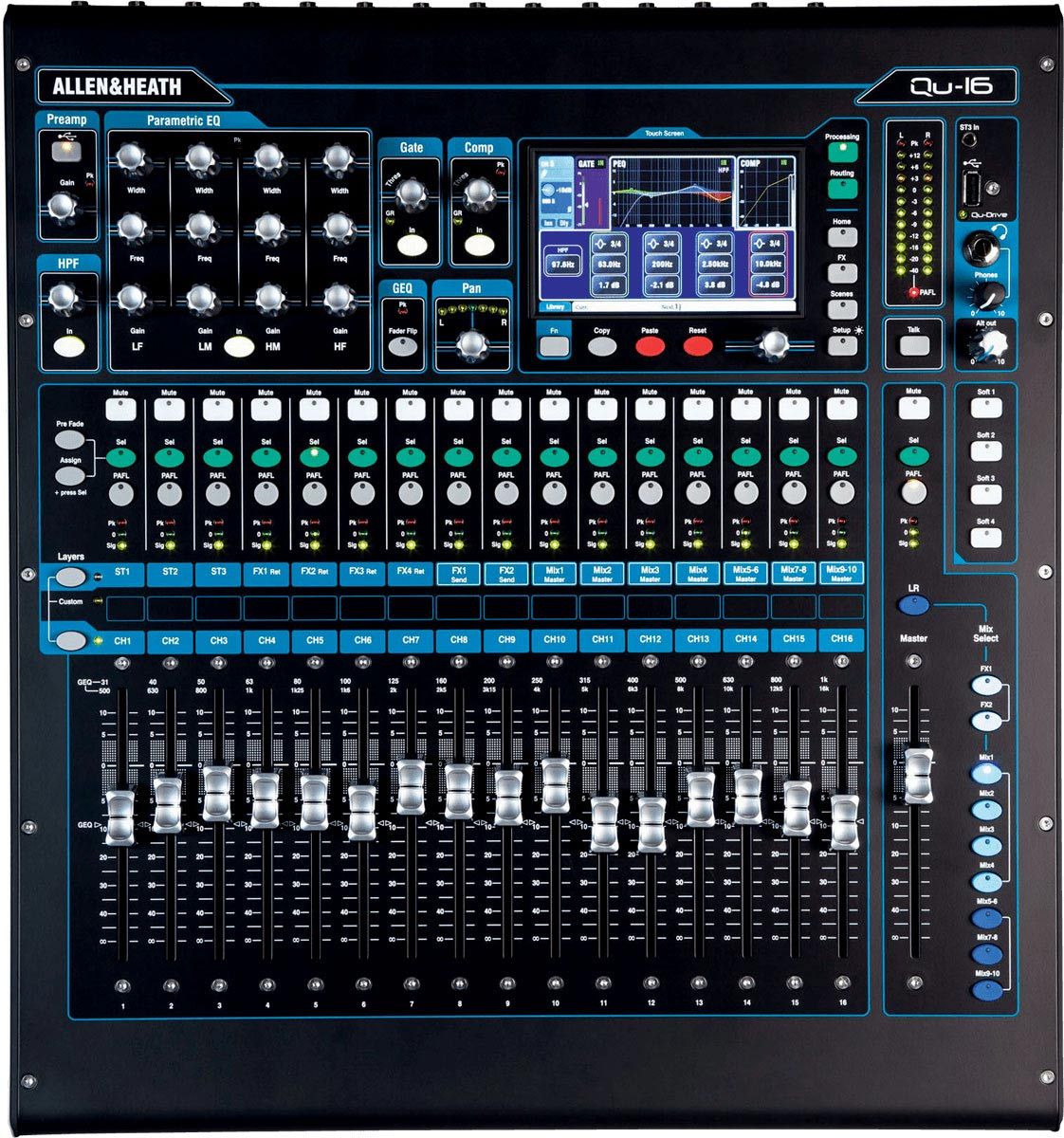 Issue de la gamme iLive et GLD , la nouvelle console numérique QU-16 en conserve l’ergonomie et un énorme potentiel, le tout dans un format compact et intuitif. 16 faders motorisés multipliés par 3 couches (entrées de 1-16 / entrées Stéréo, retour effets stéréo, départ vers FX internes et bus de mixage / Custom user) et un fader Master.