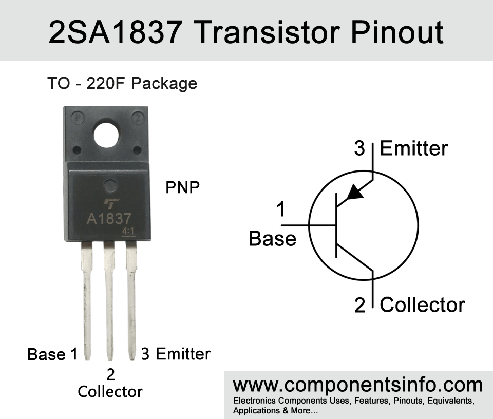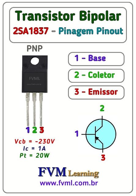 Transistor bipolaire PNP 230V 1A. Boîtier: TO-220F. Tension collecteur-émetteur maxi: 230V 2SA1837 (C5-T28)