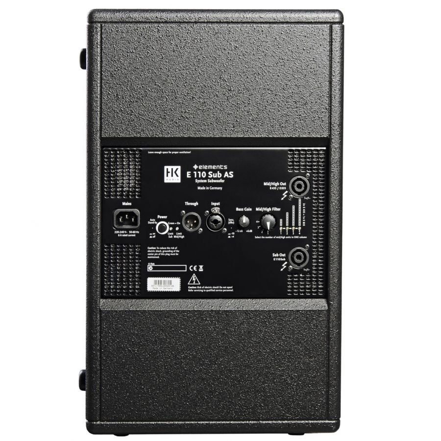Caisson de basses amplifié 10" gamme HK Elements, puissance de 600 Watts en sortie et amplifie également pour 600 Watts de satellites et/ou caisson passif de la gamme.