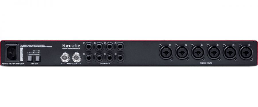 Points forts - 8 préamplis micro Scarlett au son naturel, sans artefact, au headroom exceptionnel et faible bruit - 8 entrées ligne symétriques - Conversion et fréquences d'échantillonnage jusqu'à 192 kHz - 2 entrées instrument sur le panneau avant - Pad sur chaque canal - 8 sorties ligne symétriques - Indicateurs de niveau d’entrée Led 5 segments - Connectivité ADAT en entrée - Alimentation 48V pour la totalité des 8 préamplis micro - Horloge ultra-précise avec E/S Word Clock en BNC - 2 ans de garantie Focusrite