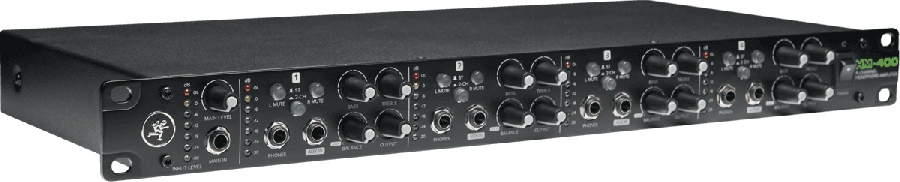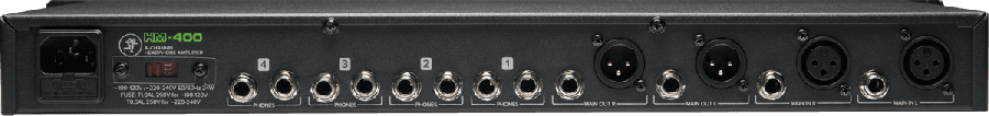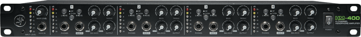 Amplificateur de casque 4 canaux disposant de trois sorties casques pour chacun des entrées disponibles, avec des entrées stéréo principales gauche et droite, une entrée auxiliaire sur chaque canal avec contrôle de balance vers le mixage principale et le signal auxiliaire, pour un total de douze sorties casques.